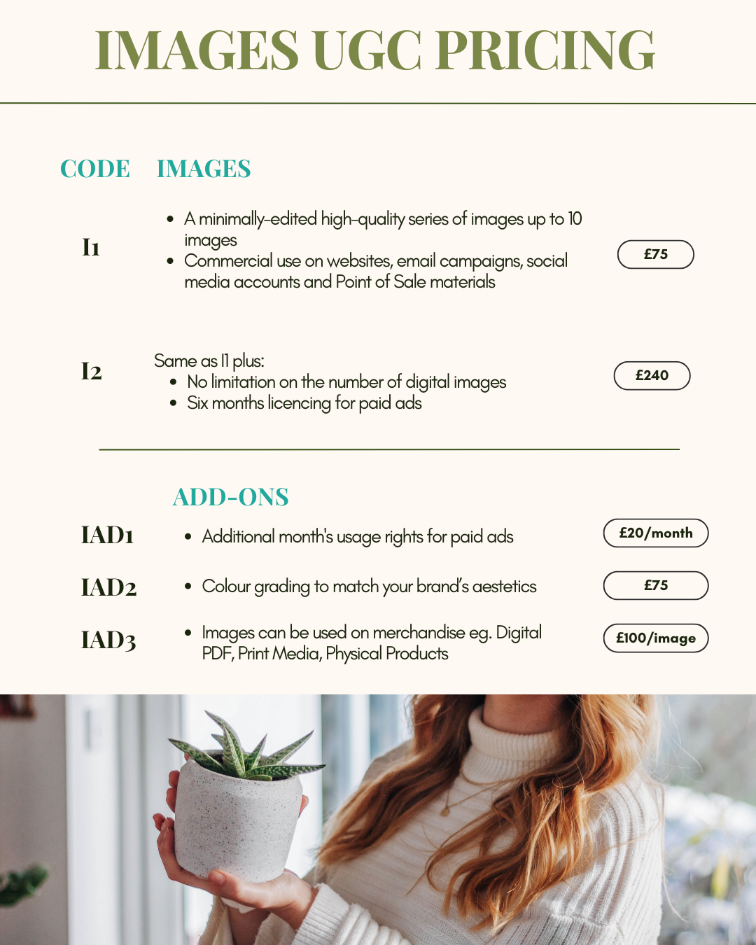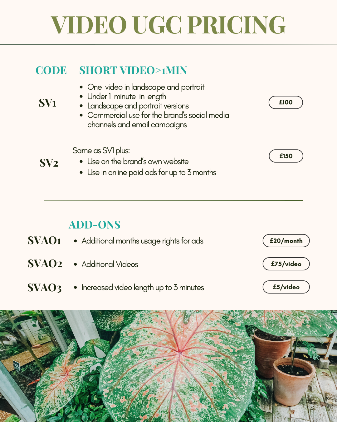 - UGC (User Generated Content) Content where I create for brands to post on their website and own social media channels. There is also an option for businesses to purchase temporary licences to run this content as online adverts. UGC works particularly well for TikTok and Meta ads.