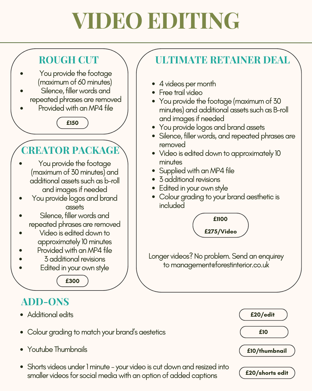 - Video Editing Not everyone has the time to edit their own videos especially if they're busy either working or creating more content. That's where I come in! I can edit long-form videos for YouTube and websites in your own style. Multiple packages include Rough Cut editing and Retainer services.